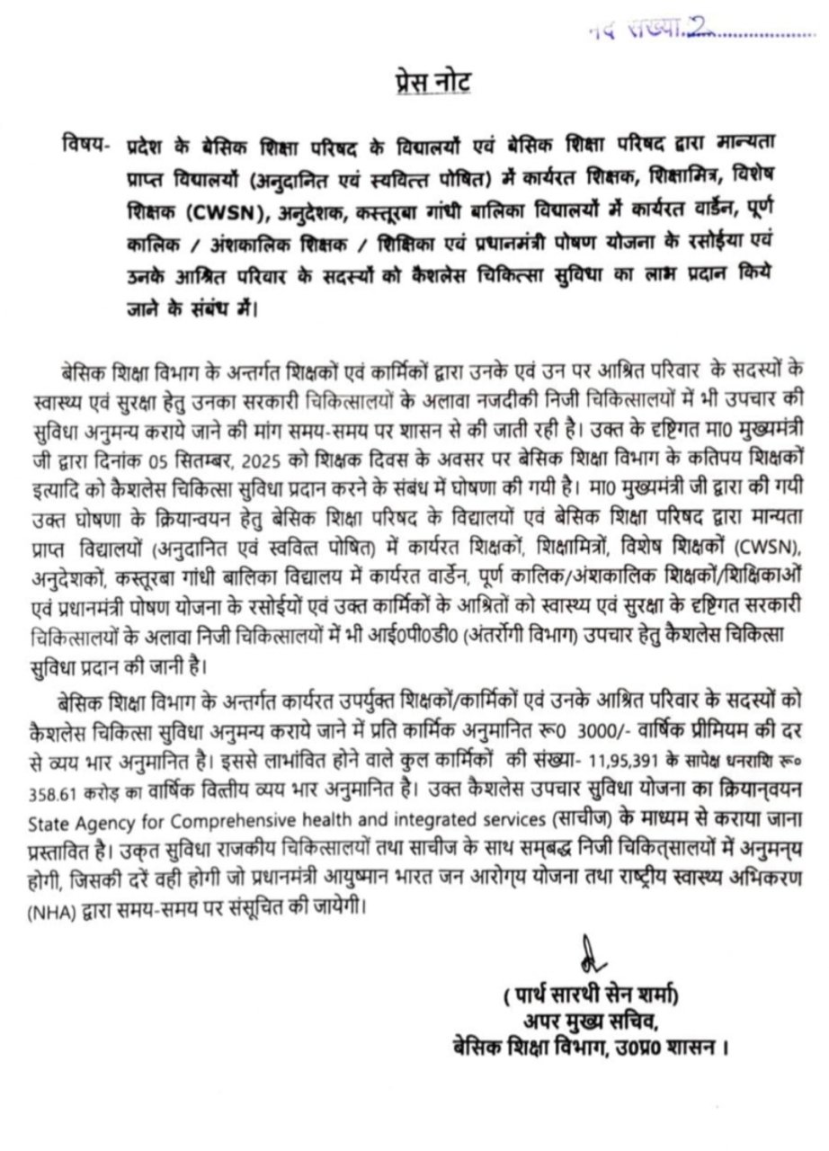 UP basic education employees medical scheme:उत्तर प्रदेश के बेसिक शिक्षा विभाग से जुड़े शिक्षकों और कर्मचारियों के लिए स्वास्थ्य सुविधा से जुड़ी एक नई व्यवस्था की तैयारी की जा रही है। विभाग के अधीन काम कर रहे शिक्षक, शिक्षामित्र और अन्य कार्मिक अब कैशलेस इलाज की सुविधा ले सकेंगे। इस सुविधा का लाभ उनके साथ उनके आश्रित परिवार के सदस्यों को भी मिलेगा। माना जा रहा है कि इलाज के बढ़ते खर्च और भुगतान से जुड़ी परेशानियों को देखते हुए यह कदम उठाया गया है।