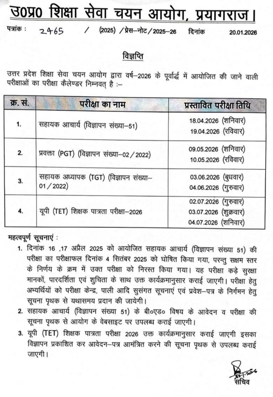 इसके अतिरिक्त परीक्षा के आयोजन को लेकर विभिन्न एजेंसियों के साथ समझौता पत्र और मानक संचालन प्रक्रिया (SOP) पर भी चर्चा की गई। इन्हीं सभी बिंदुओं पर विचार करते हुए आयोग की बैठक में यूपीटीईटी, टीजीटी, पीजीटी और सहायक आचार्य परीक्षा का कार्यक्रम घोषित किया गया।